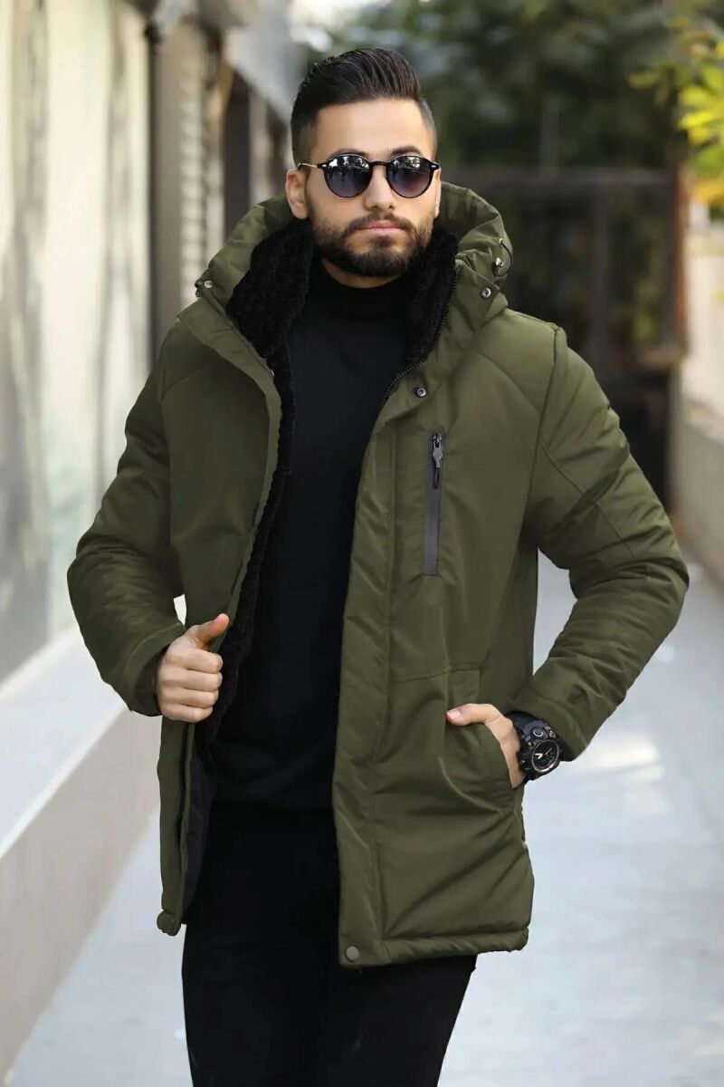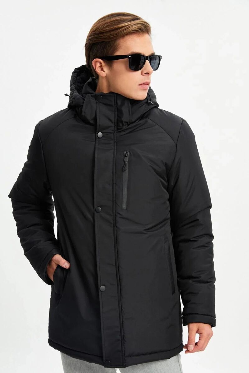 İçi Kürklü Su ve Rüzgar Geçirmez Cepli Kapüşonlu Erkek Mont