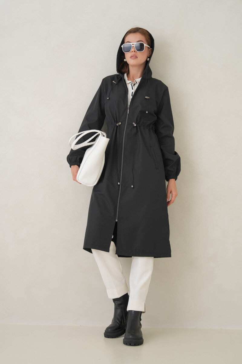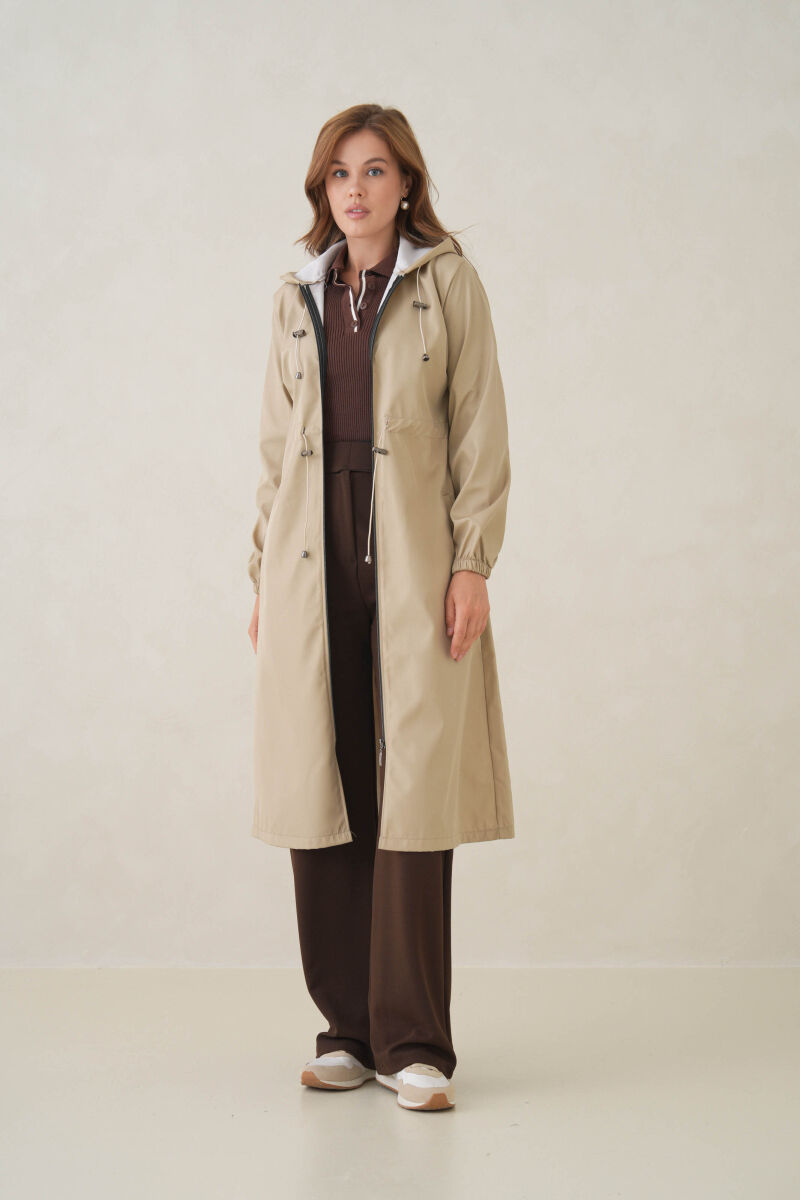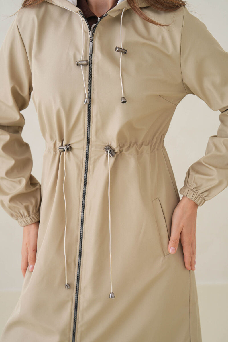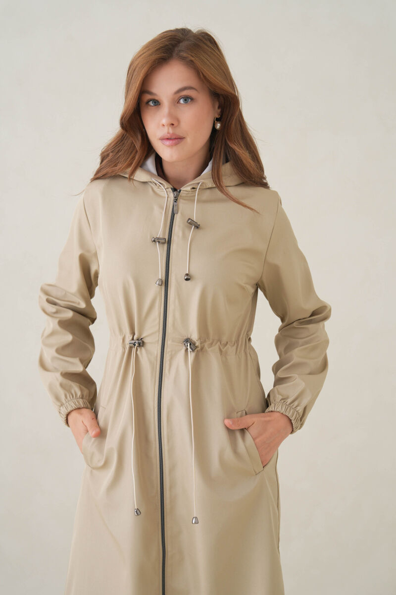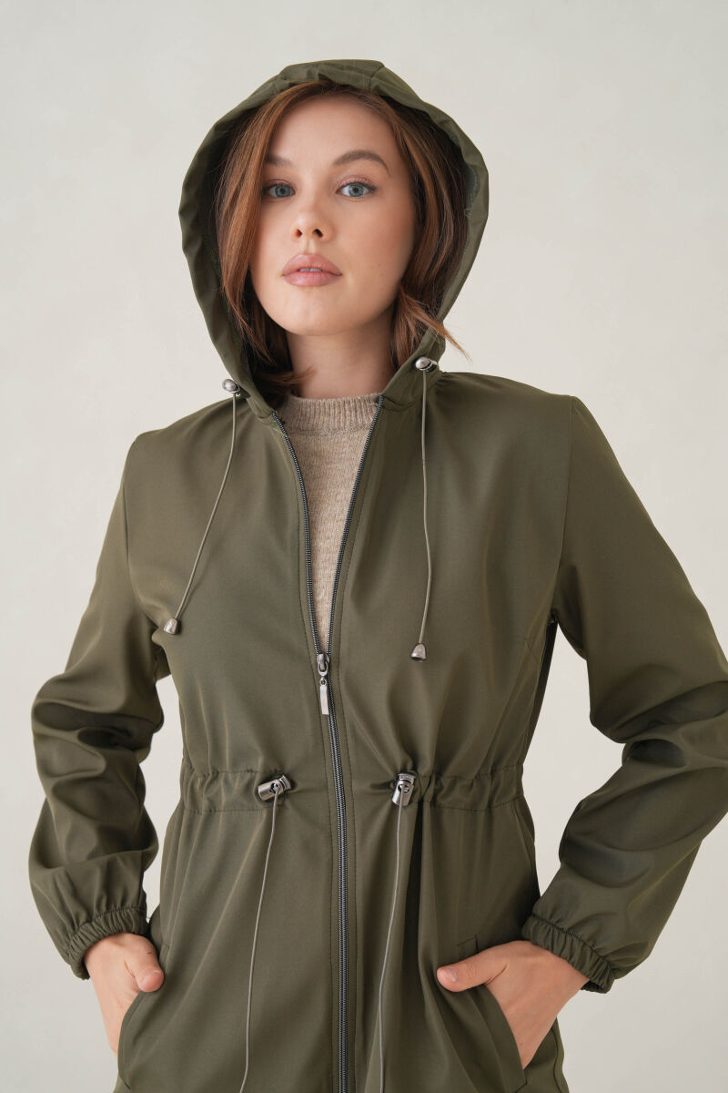 Su Geçirmez Kapüşonlu Fermuarlı Sık Dokuma Kadın Trençkot