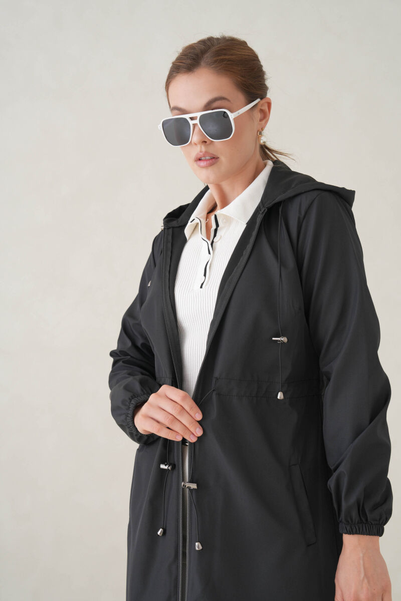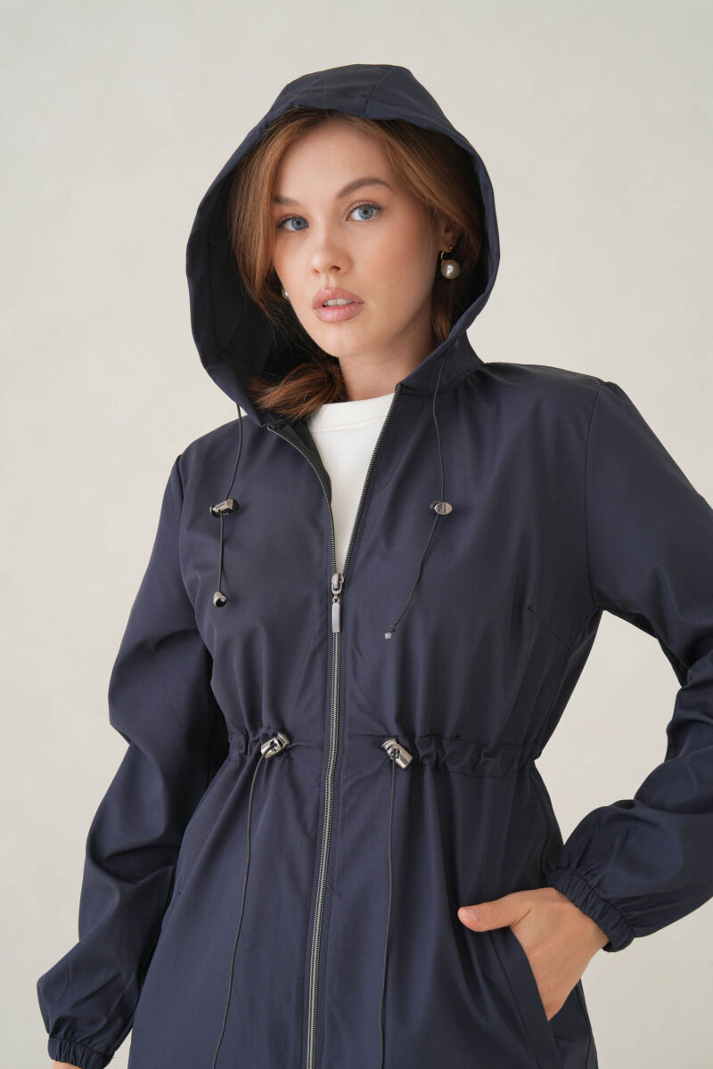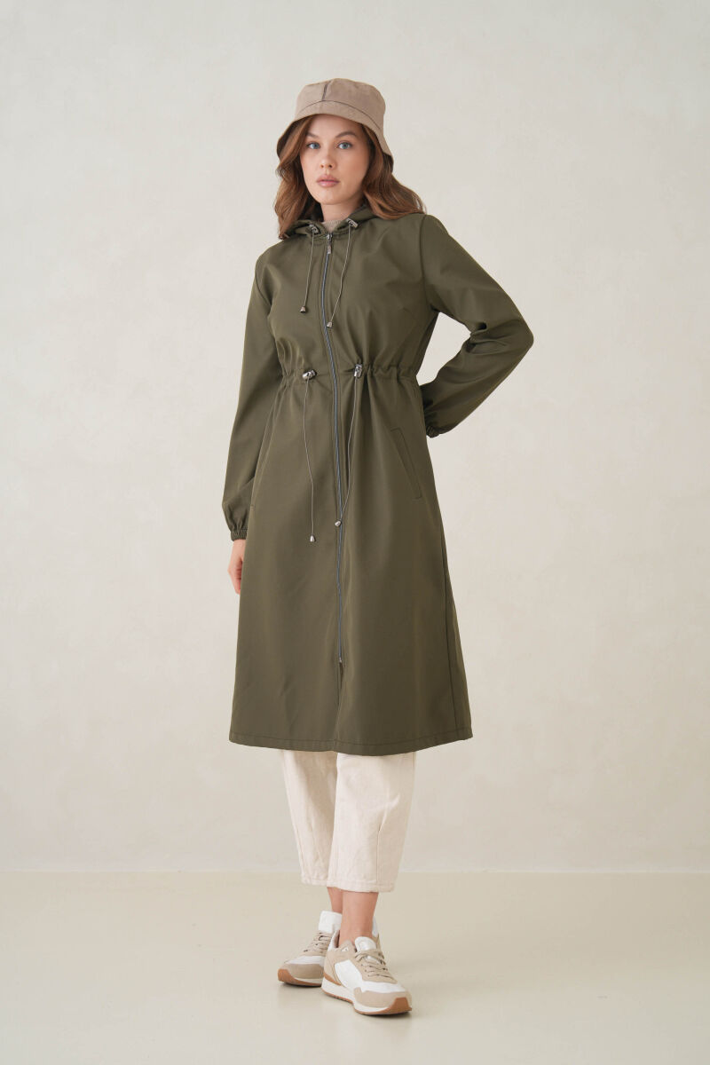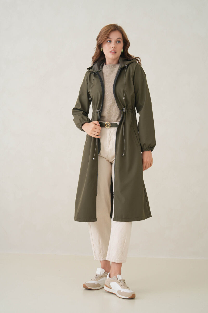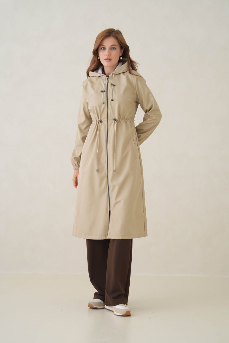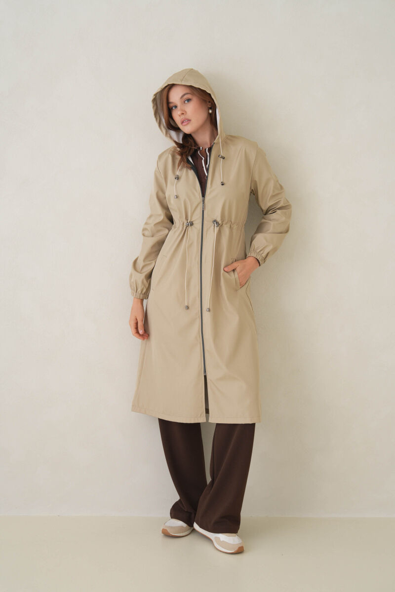 Su Geçirmez Kapüşonlu Fermuarlı Sık Dokuma Kadın Trençkot