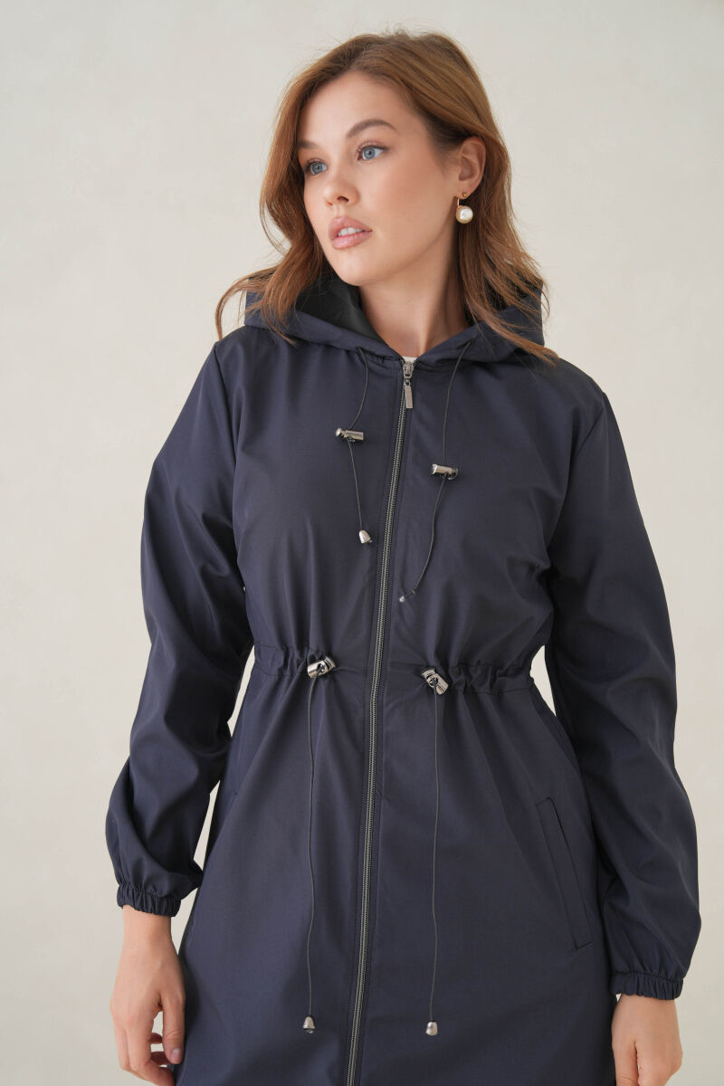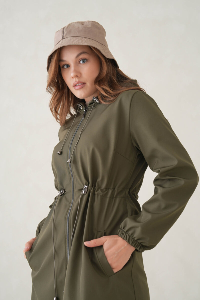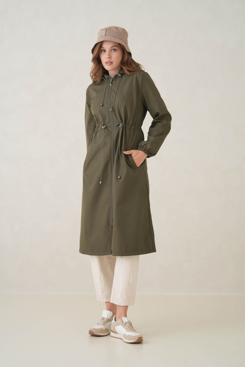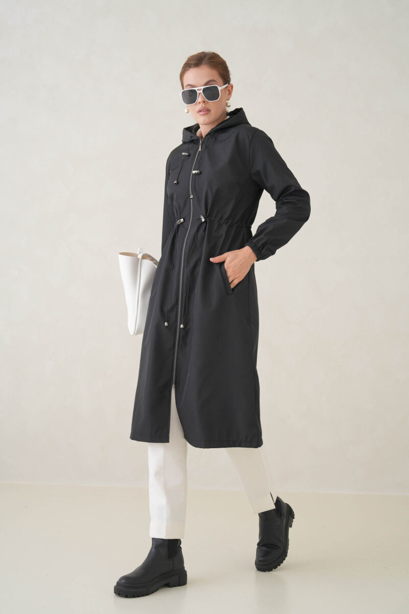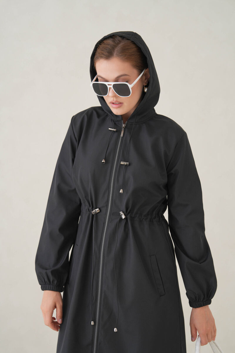 Su Geçirmez Kapüşonlu Fermuarlı Sık Dokuma Kadın Trençkot